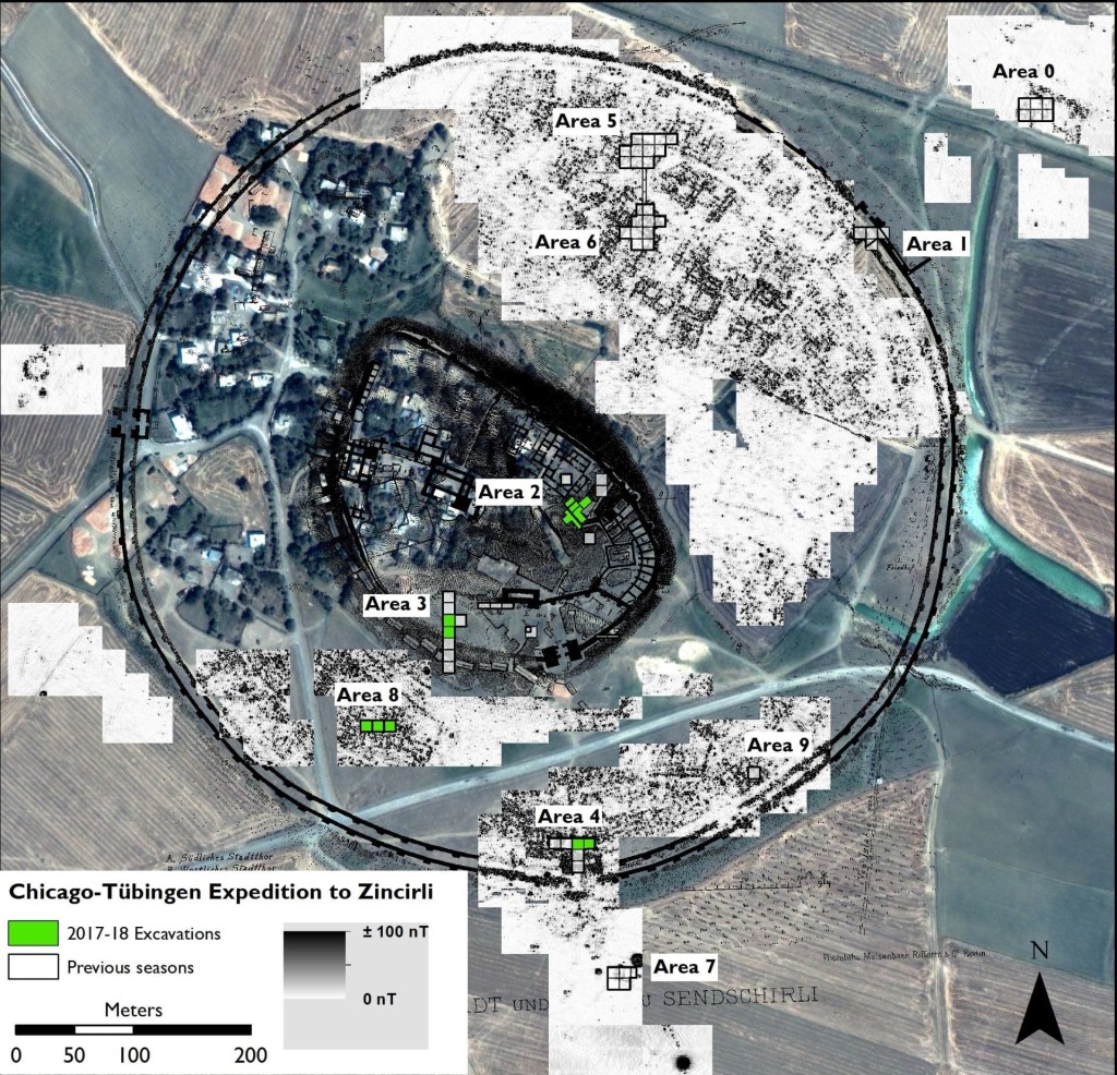 Fig. 1. Map of Zincirli showing the ten current excavation areas, with the geomagnetic survey results and the architectural plan made by the German expedition in 1894 both superimposed on a modern satellite image of the site. Elaborated by Jason Herrmann. Courtesy of the Chicago-Tübingen expeditionFig. 2. Selection of ceramics and small finds found on the floor of Room DD10 of Area 2. Photograph by Roberto Ceccacci. Courtesy of the Chicago-Tübingen expedition